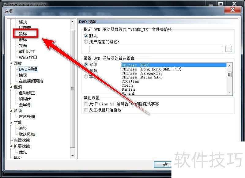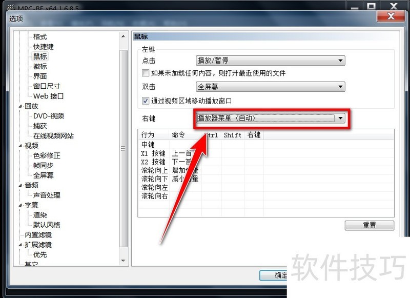 4、 在“鼠标”设置中,点击“播放器菜单自动”。