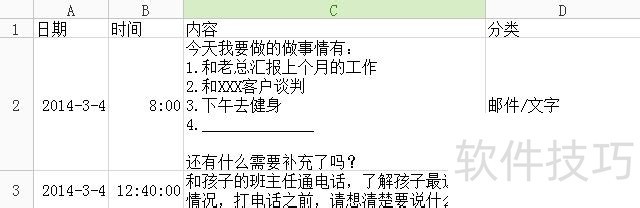 2、 创建日程1. 使用Excel软件来创建一个基本的日程安排,花上10分钟,尽可能详细的描述相关细节。下图是一个示例。