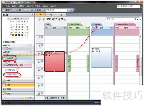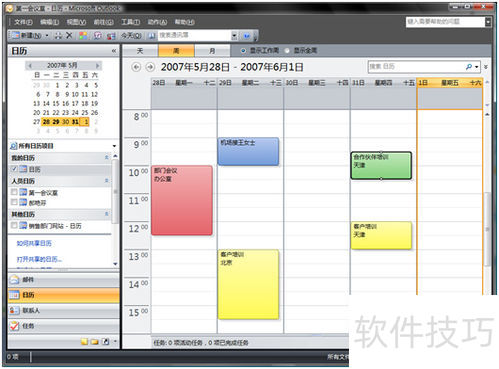 1、 与同事之间安排会议、约定时间在日常办公中是一件繁琐的事情,如果使用传统的沟通手段,例如打电话或者发送电子邮件询问,往往要经过大量的反复过程才可以最终确定。其实,在Microsoft Office Outlook 2007中,我们可以将自己的日程安排、同事的日程安排、资源的日程安排,甚至所在团队的日程安排集中显示在一个视图中,让我们的沟通与协调变得更加有的放矢。?在Microsoft Office Outlook 2007中查看同事时间安排的操作步骤如下:2打开Microsoft Office Outlook 2007,在左侧的导航窗格中单击【日历】按钮,切换到日历视图,此时你将看到自己的日程安排信息?
