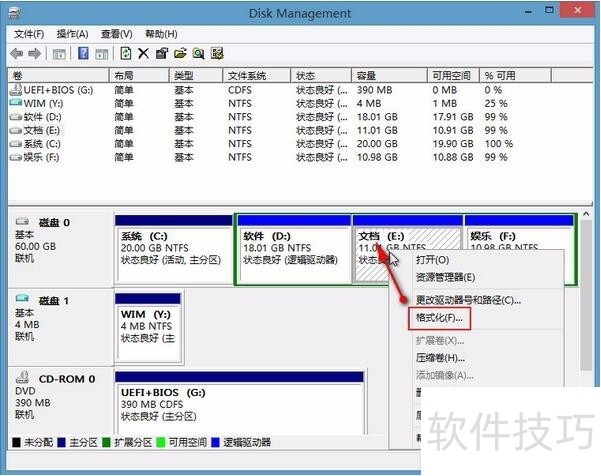 4、 右键单击选中需要操作的分区,选择“格式化”选项,如下图所示: