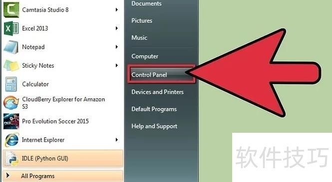 2、 点击开始,控制面板