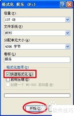 3、 就会出现如下对话框.点击快速格式化,然后点开始即可