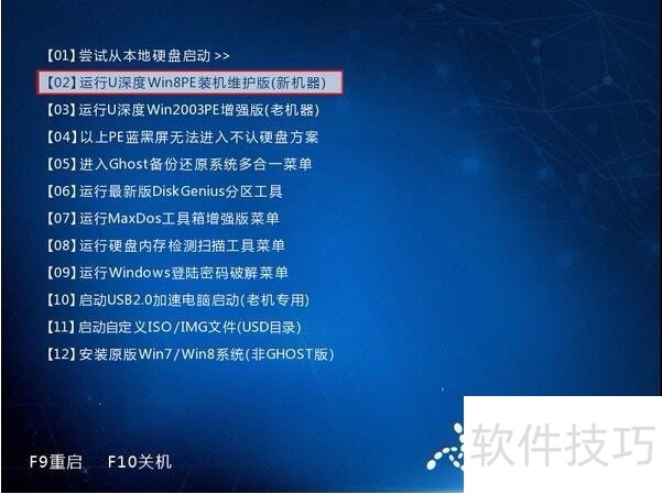 1、 将制作完成u深度u盘启动盘连接至电脑,重启电脑等待出现开机画面时按下启动快捷键进入启动项窗口,选择【02】运行U深度Win8PE装机维护版(新机器),按回车键确认,如下图所示:
