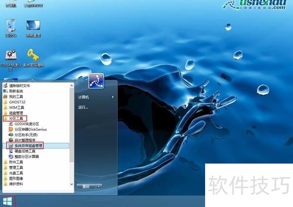 2、 进入win8pe系统,依次点击“windows图标-分区工具-系统自带磁盘管理”选项,如下图所示: