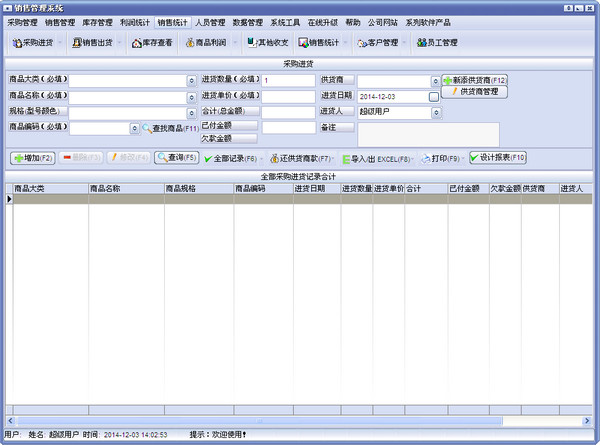 全能商品销售管理系统是专为小型企业、店铺、个人开发的进、销、存管理、理财、员工管理的销售管理软件,具有商品管理、进销存单据管理、库存管理,利润查看,员工成绩图表查看,月销售成绩图表比较查看,日销售统计报表,月销售统计报表,年销售统计报表,并可以打印各种报表并导出EXCEL,可以根据各种条件组合查询、汇总,软件具有功能完备、实用简单、使用方便,上手快的特点,是小型企业、店铺、个人理想的管理和理财工具。