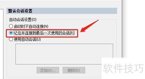 4、 勾选记住并连接最后一次使用的会话,如图: