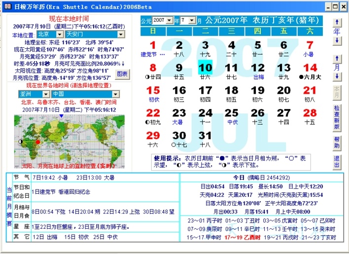 日梭万年历是一款功能丰富的万年历软件,它采用现代高精度天文算法生成公历、农历、回历三历对照,并提供丰富的信息和历史数据。用户可以通过该软件查询每日日期、节气、节假日等信息,还可以了解太阳、月亮在天空中的位置以及地球上的直射位置。此外,该软件还支持查询各种时间信息的最大误差不超过一分钟,是专业领域和日常生活中的可靠工具。新版的5.0版增加了日月在天空中的位置图示、日月在地球上的直射位置图示以及伊斯兰历,并更新了世界时区信息和部分城镇的经纬度数据。同时,该软件纯绿色,不需安装,拷入任何一个文件夹后即可运行,并且删除也非常简单。日梭万年历是一款功能强大、高精度的万年历软件,在专业领域和日常生活中都具有很高的实用价值。