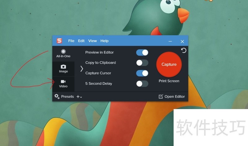 1、 ?打开Snagit,截图面板切换到video, 默认识停留在截图面板, 这里将它切换到第3个录屏面板