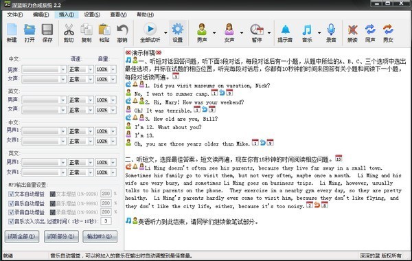 深蓝听力合成系统是一款功能强大的英语听力素材合成软件。它能够将英语文本转换成MP3文件,提供中文男声Liang、中文女声Hui、英语男声Paul和英语女声Julie等多种声音选择。用户可以根据自己的听力练习进度调节合成语音的语速,逐步增加难度。同时,软件还具备暂停、禁读、音乐、录音和提示音等功能,方便用户进行听力训练。此外,用户还可以对输出的MP3音量进行设置,如自动增益和淡入淡出等效果。这款软件操作简单易用,适合各类英语学习者使用。