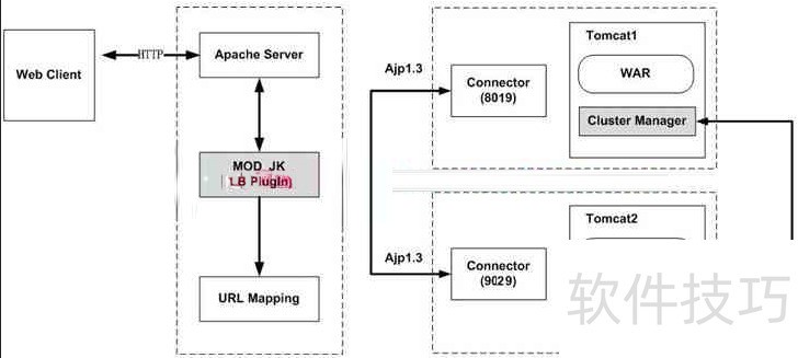4、 如下图的架构,下面是原理1)Apache装有一个模块,这个模块叫mod_jk2)Apache通过80端口负责解析任何静态web内容3)任何不能解析的内容,用表达式告诉mod_jk,让mod_jk派发给相关的app server去解释。