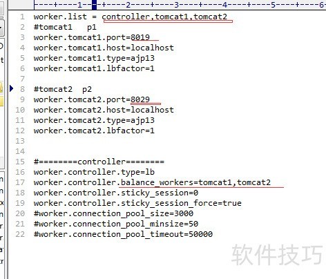 6、 ?Worker.properties文件内容如下:图中的这些设置的意思用中文来表达就是:ü?? 两个tomcat,都位于localhostü?? 两个tomcat,tomcat1用8019,tomcat2用8029与apache保持jk_mod的通讯两个配置,见网络经验http://jingyan.baidu.com/article/636f38bb5fe8e9d6b946105f.html
