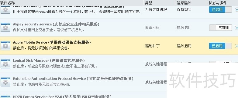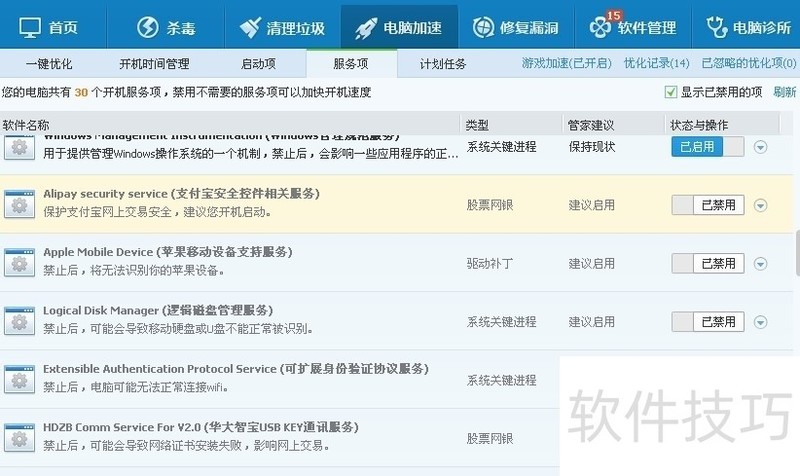 2、 ?打开电脑管家等程序后,找到开机加速或者电脑加速,然后找到启动项,在里面一一查找有关于快用的程序,如果禁止了就都打开,保持在已开启的状态。然后再重新打开快用苹果助手试一试。