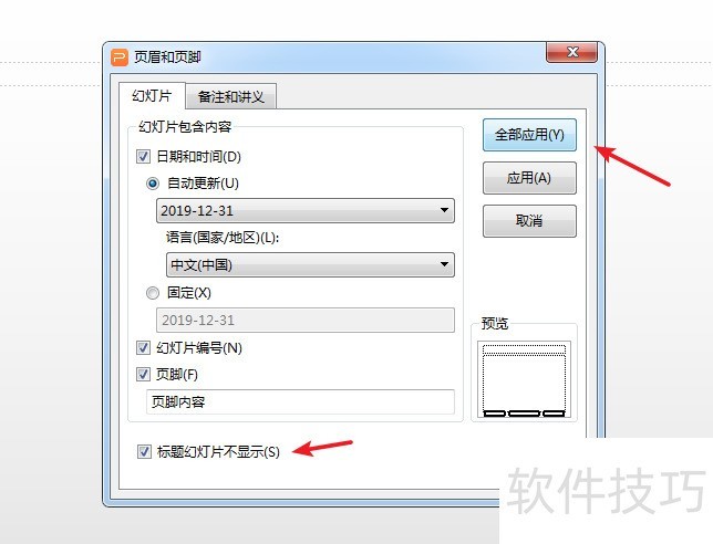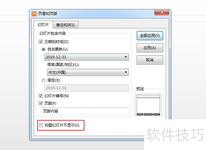 3、 在页眉页脚窗口中有个“标题幻灯片不显示”的选项,标题幻灯片就是第一张幻灯片。