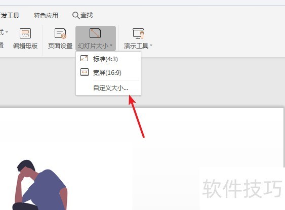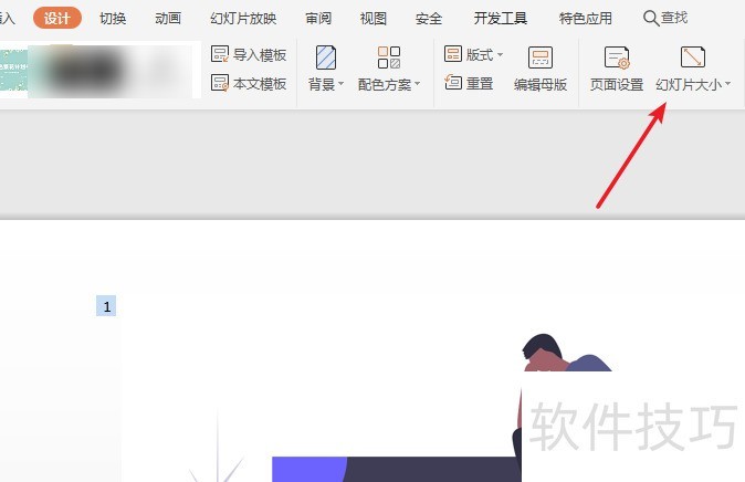 5、 打开“设计”菜单栏下的“幻灯片大小”