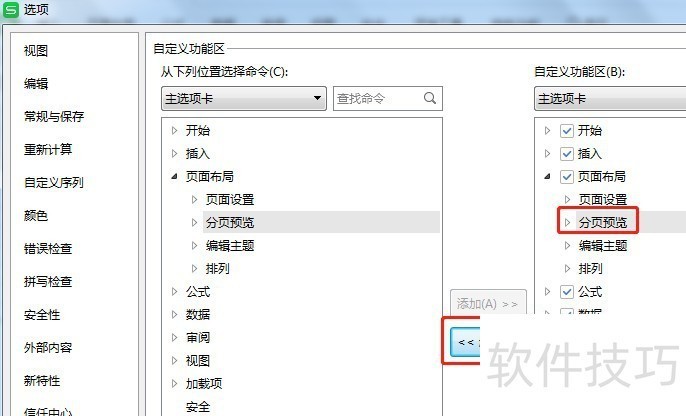 4、 在右边的自定义功能区里面选中【页面布局】里面的【分页预览】,然后点击【删除】