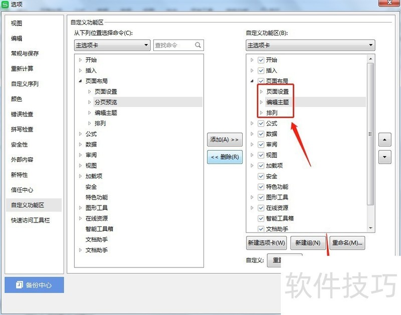 3、 点击左侧栏的【自定义功能区】