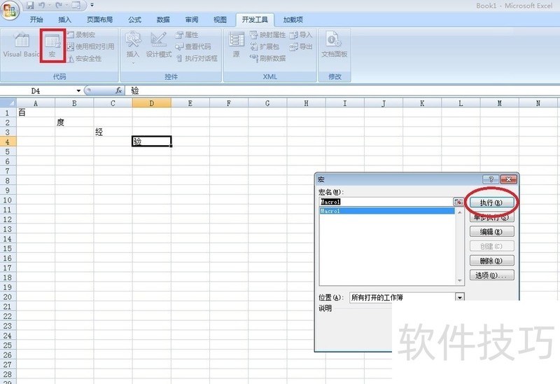 5、 在点左上角的宏,就能看到我们刚刚录制的宏命令,关闭弹窗,将我们刚刚输入的字删除。然后再次点开宏—执行,它就能自动生成刚刚输入的字了。