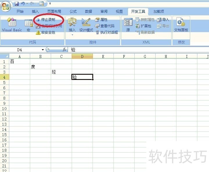 4、 就开始录制了,我们可以进行一系列操作,Excel会记住我们的操作,将其转为VBA宏代码。例如:在如图中相应位置输入了“网络经验”。完成操作后,点停止录制。