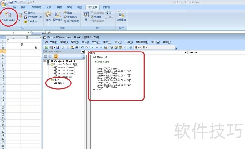 6、 重点来了,点左上角Visual Basic按钮—弹窗中点模块 ,就能看到我们刚刚操作的VBA代码了。