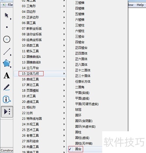 1、 一、绘制圆台1.打开几何画板数学课件制作工具,单击侧边栏“自定义工具”——“立体几何”——圆台。