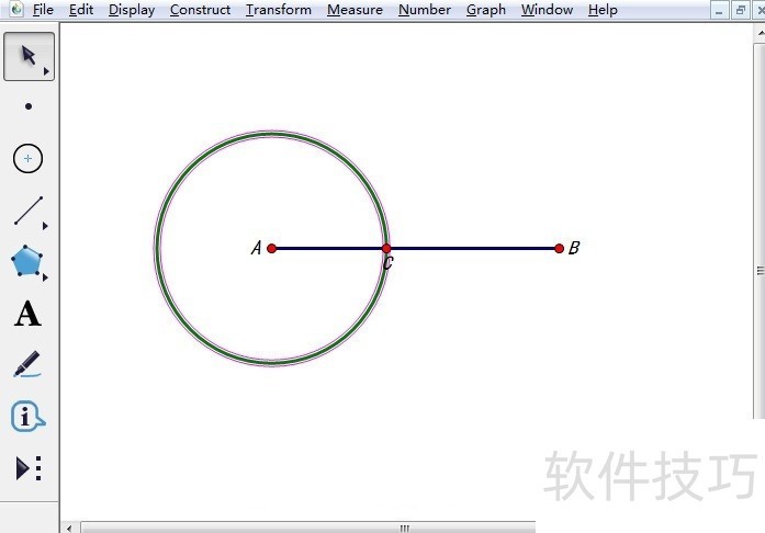 2、 步骤二 在线段上取点C作线段AC和BC。选中线段AB,执行“构造”——“线段上的点”命令,画出线段上的点C。然后用“线段工具”分别作出线段AC和BC。
