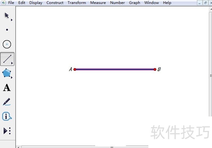 1、 步骤一 绘制线段AB。打开几何画板软件,选择左侧侧边栏“线段工具”,在空白区域单击鼠标画出线段的一个端点,然后按住Shift键,在适当位置单击,就可以画出水平线段,标记端点为A、B,如下图所示。