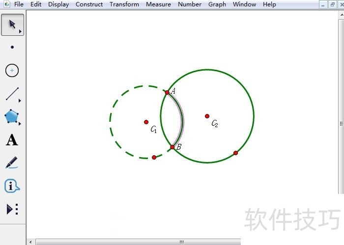 3、 步骤三 构造圆c2上的弧。依次选中点A、B和圆c2,执行“构造”——“圆上的弧”命令,这样就完成了构造圆上的弧操作。
