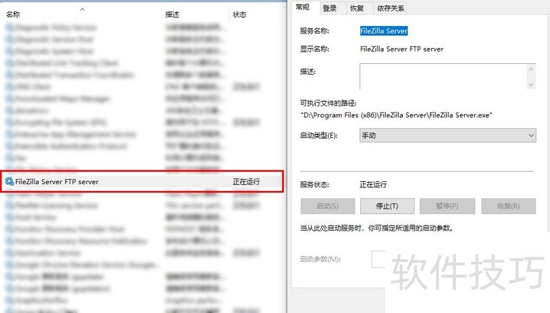 1、 进入到Windows系统,打开"系统服务"操作对话框,确认并启动电脑上安装的FileZilla Server服务器工具软件的后台服务。