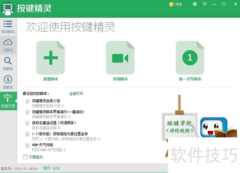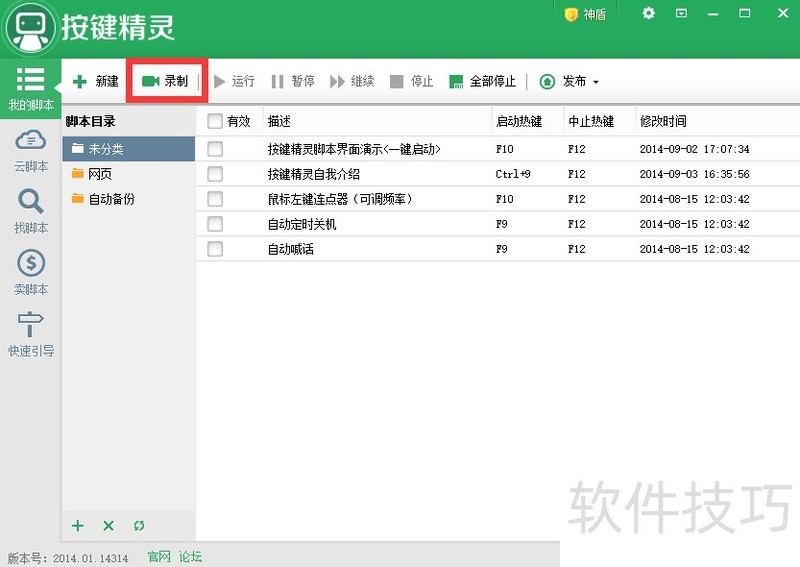1、 ?按键精灵的核心是脚本,通过执行已制作好的脚本来完成批量、重复性的操作。因此制作脚本便成为掌握按键精灵的核心。下面小编就教大家通过两种方法来制作脚本程序。其中一种方法是通过“录制操作过程”来自动制作脚本,另一种方法是通过编程方式来制作脚本。