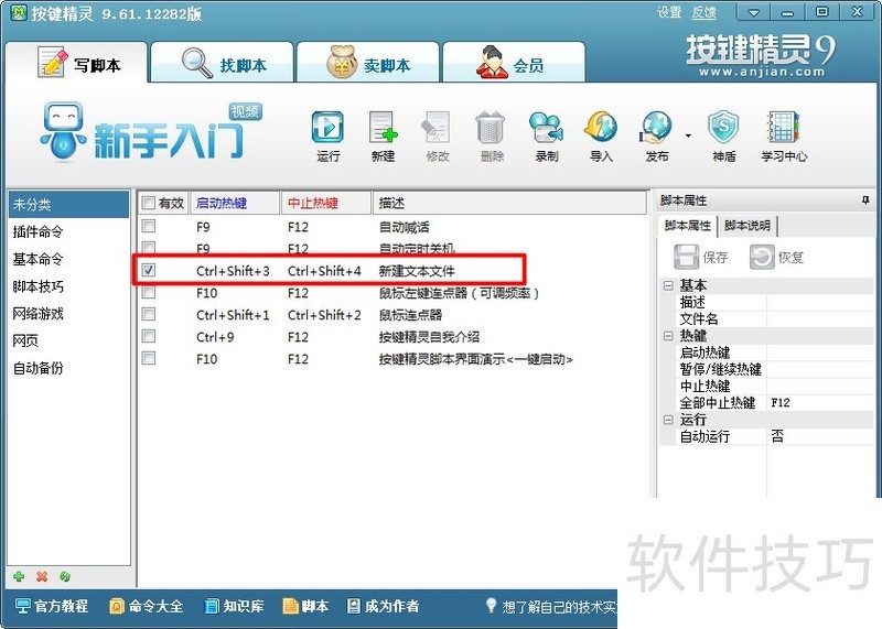 6、 ?在返回的“我的脚本”界面中,在界面右侧将“脚本属性”栏目中的“描述”进行重命名,如“新建文本文件”等,并设置“启动热键”和“停止热键”,然后点击“保存退出”按钮。