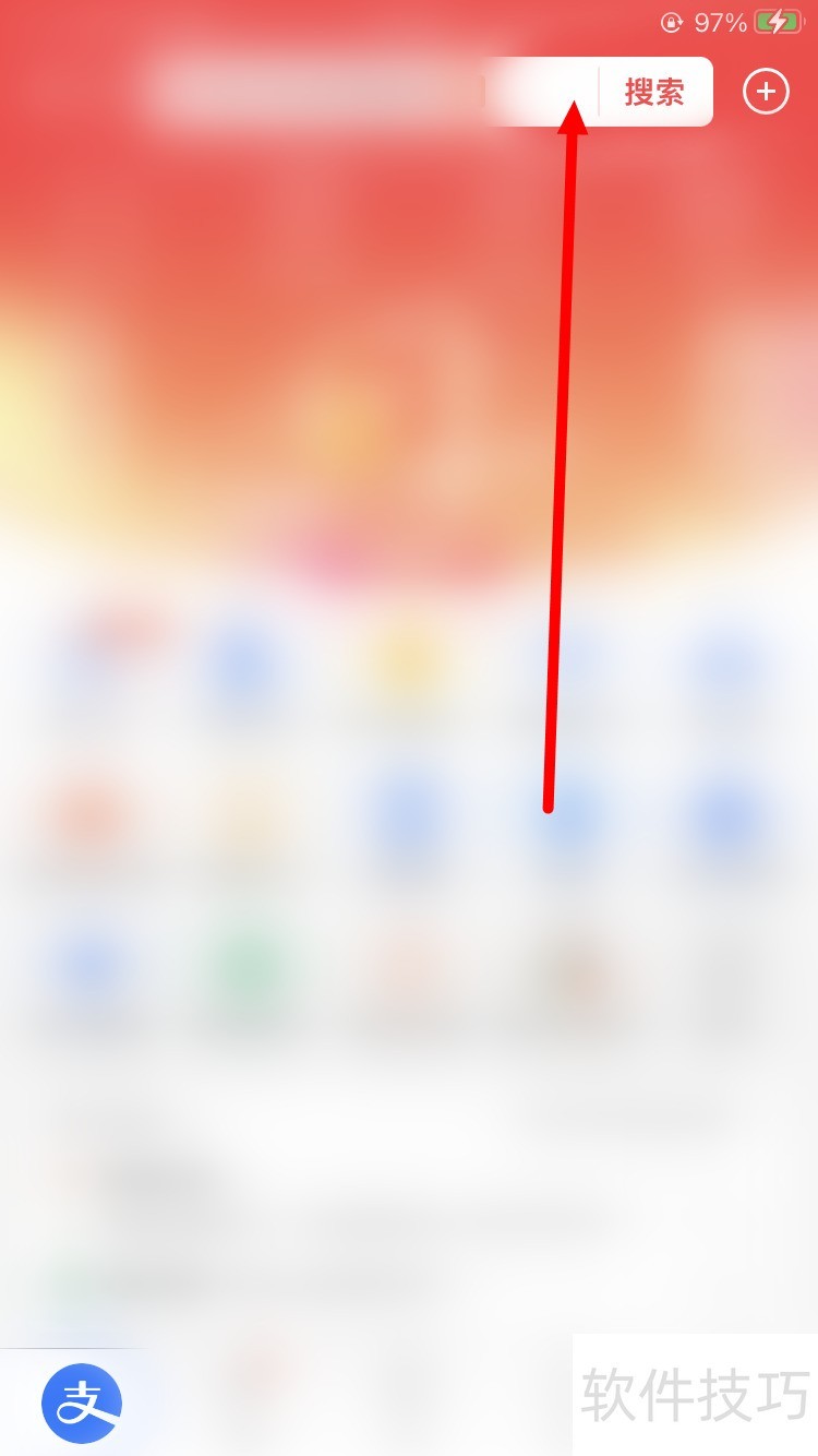 1、 首先在手机上打开并登录支付宝,并在首页面的搜索栏里输入【快递100】。