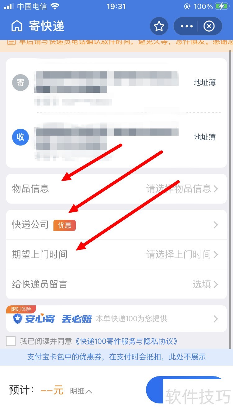 4、 接着,设置【物品信息】、【快递公司】、【期望上门时间】。