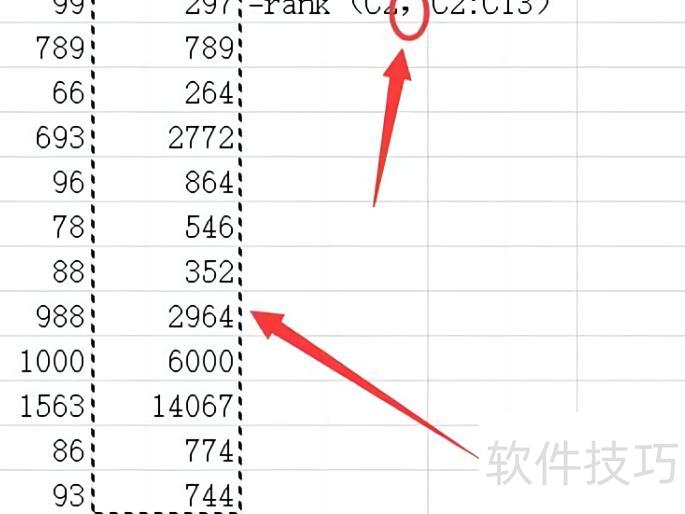 将鼠标移至括号内,选中用于排名计算的第一个单元格。