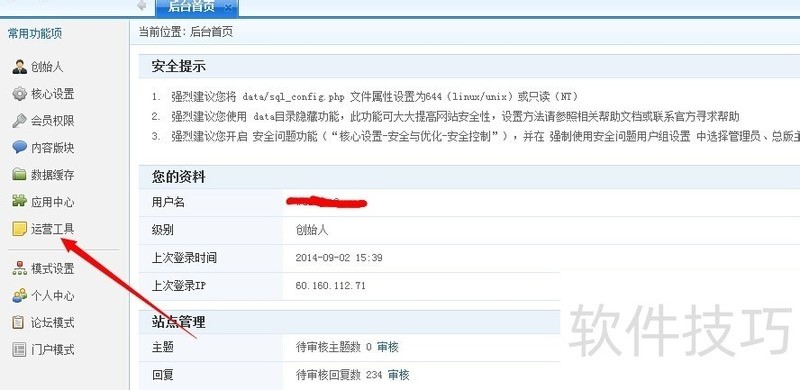 3、 进入网站的后台管理页面后,打开运营工具选项(运营工具选项在左侧的导航栏里);