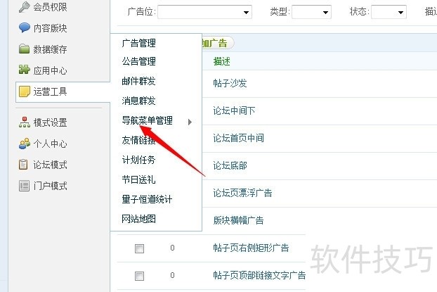 4、 打开运营工具选项后,再打开导航菜单管理选项进入下一级目录;
