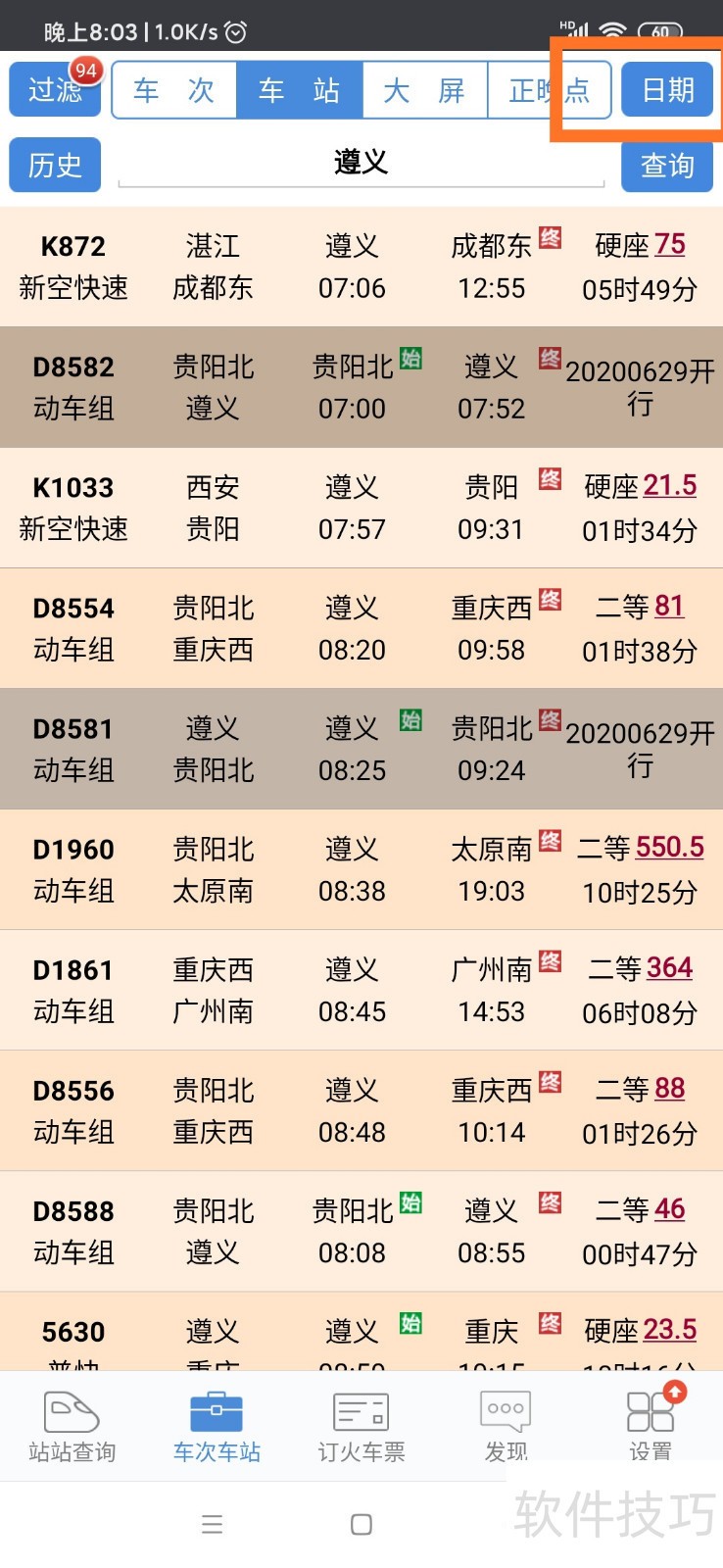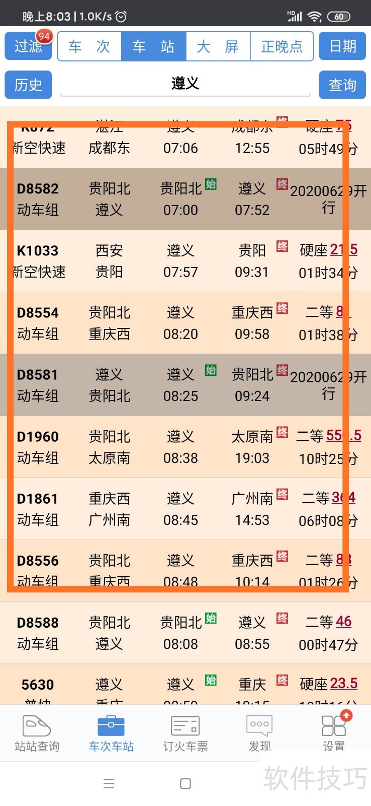 4、 点击后如图,出现经过遵义火车站的所有车次,可以上下滑动,找到自己想要查询的车次,进入查看停靠站及时刻表。?