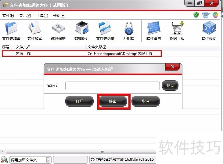 2、 进入软件后,找到需要解密的数据,然后双击需要解密的加密记录,在弹出的密码输入框中输入正确的密码,点击“解密”按钮