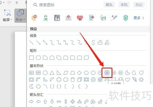 3、 在形状里面找到基本形状里面的八边形图标,单击八边形