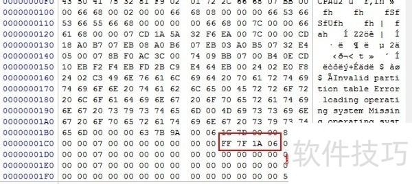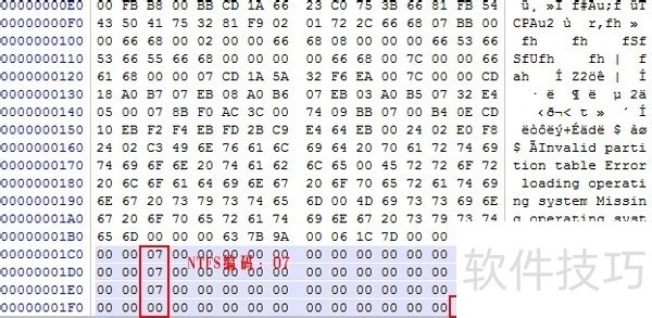 2、 我们看下3个分区表都是NTFS格式,我们在winhex中填入NTFS的编码07,并在分区表结尾输入结束标志:55AA