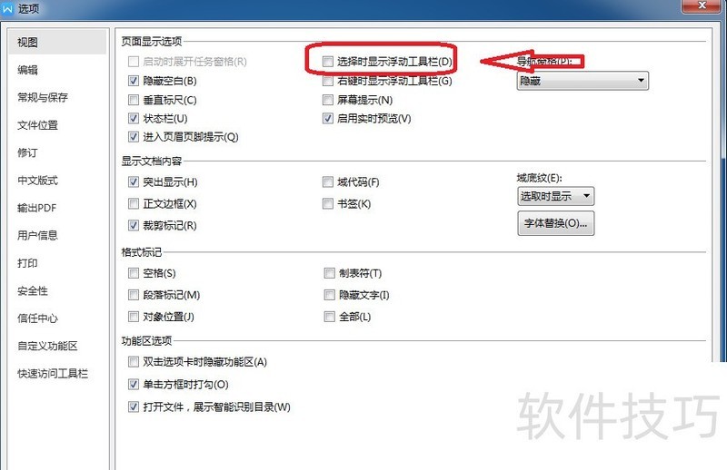 3、 第三步:将“选择时显示浮动工具栏”前面勾选去掉,如下图所示。