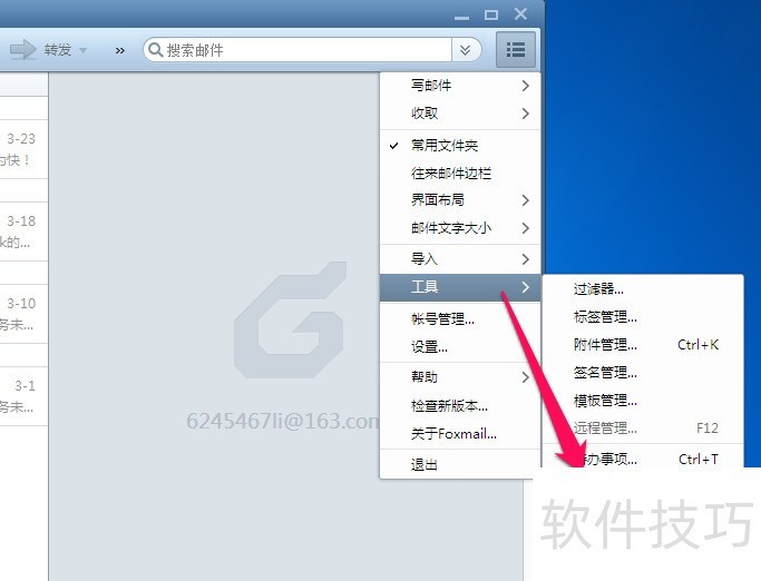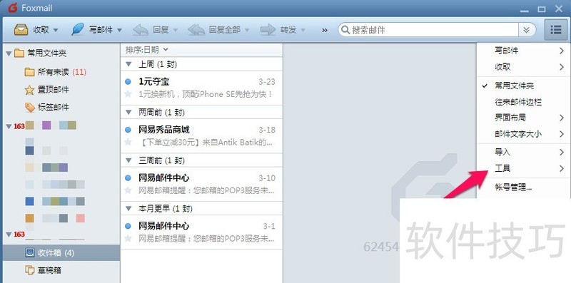 2、 在foxmail软件的列表中有很多功能,包括调节foxmail软件界面布局、邮件文字大小等等,我们选择工具选项。