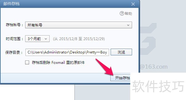 5、 选择foxmail软件邮件存档位置以后我们还可以选择存档后是否删除foxmail软件里的邮件,然后点击开始存档。