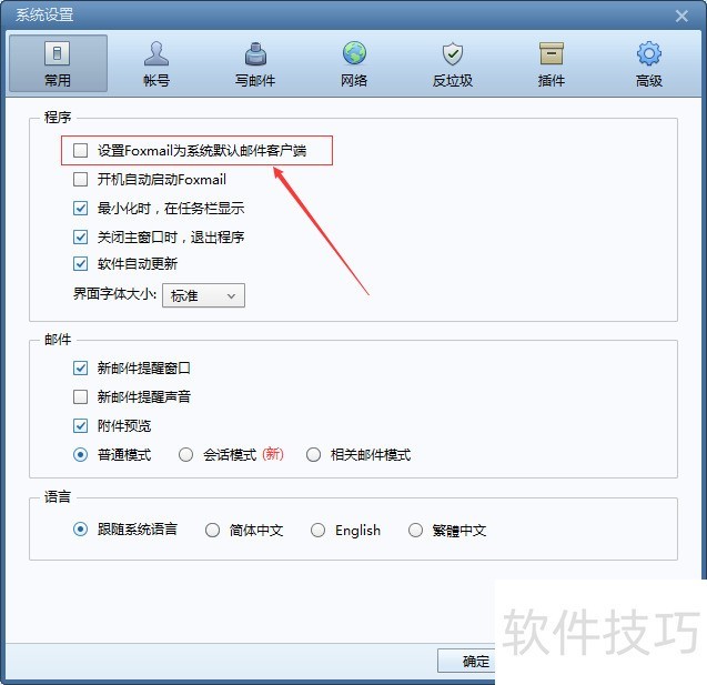5、 进入到了常用界面中,勾选上?设置Foxmail为系统默认邮件客户端 选项