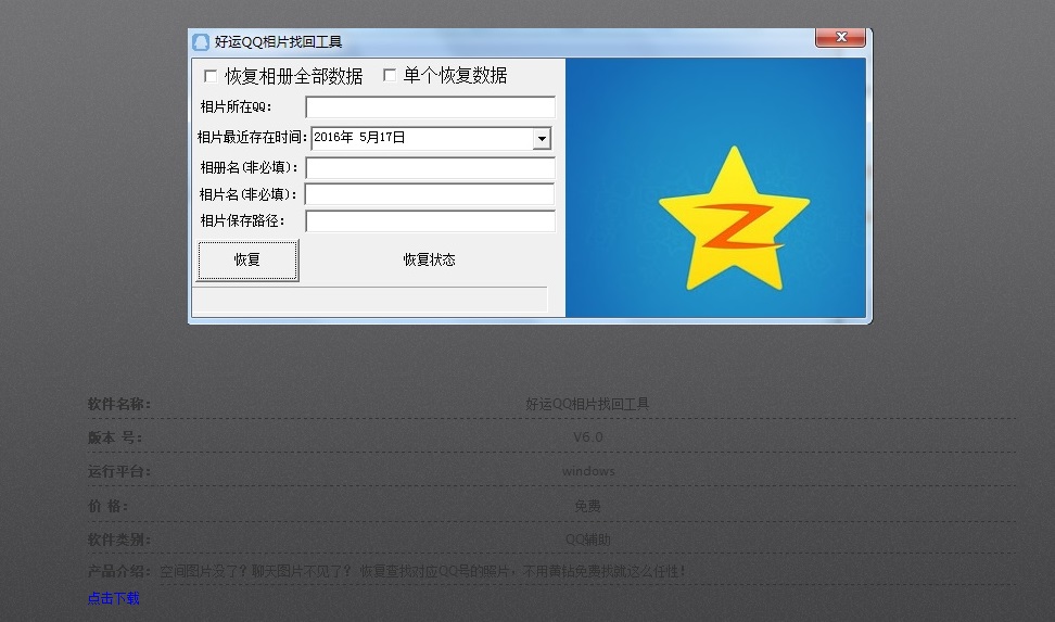 官方软件分类:照片处理大小:772 KB时间:2016-05-18软件介绍:空间图片没了?聊天图片不见了? 恢复查找对应QQ号的照片,不用黄钻免费找就这么任性!& 立即下载以上是小编精心挑选的高效照片编辑软件推荐:高下载量实用工具集锦,希望能对大家有所帮助。如有需要,欢迎下载并体验。