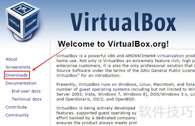 2、 点击进入virtualbox虚拟机的官方首页,然后点击左侧的Downloads按钮,如下图所示。