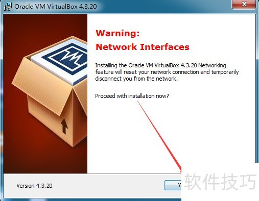 5、 在virtualbox虚拟机安装的警告界面,告诉我们在安装virtualbox虚拟机的时候会重置我们的网络设置,这里不用管了,直接点击Yes。如下图所示。