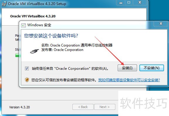 7、 进入virtualbox虚拟机安装弹出个对话框,这里我们先勾选始终信任来自“Oracle”的软件,然后点击安装,如下图所示。