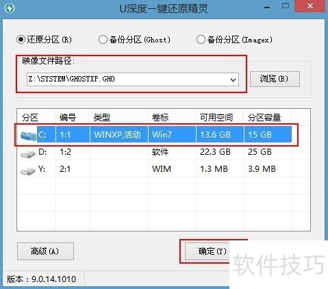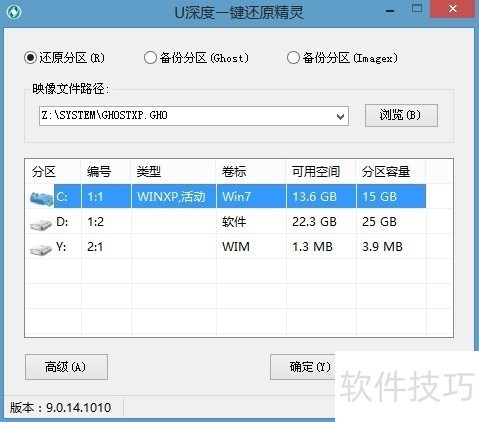 2、 在图中,我们会看到之平常在系统中所看到的界面不同,同时在我们打开软件的数秒钟后,u深度一键还原精灵会自动找到所存在u盘中的ghost系统镜像包,并提取出所需要的文件。然后我们在下方的磁盘分区列表中选择一个做为重装系统所需要的可用磁盘分区,一切选择完成后,点击确定(Y)键即可:?