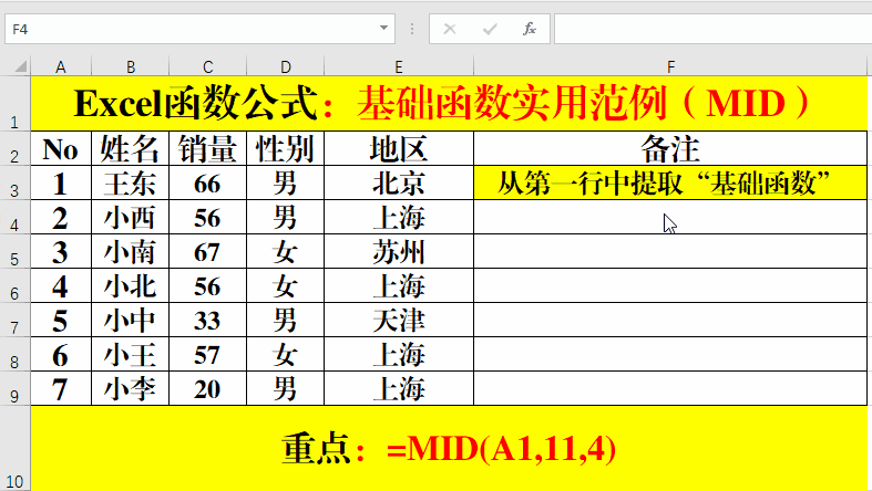 1、 一、MID函数。作用:从文本字符串中截取指定数目的字符。语法:=MID(字符串,开始截取字符的位置,截取字符的长度)。方法:在目标单元格中输入公式:=MID(A1,11,4)。