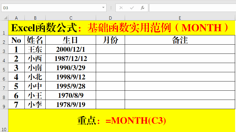 3、 三、MONTH函数。作用:提取日期中的月份。语法:=MonTH(日期或引用单元格的日期部分)。方法:在目标单元格中输入公式:=MonTH(C3)。